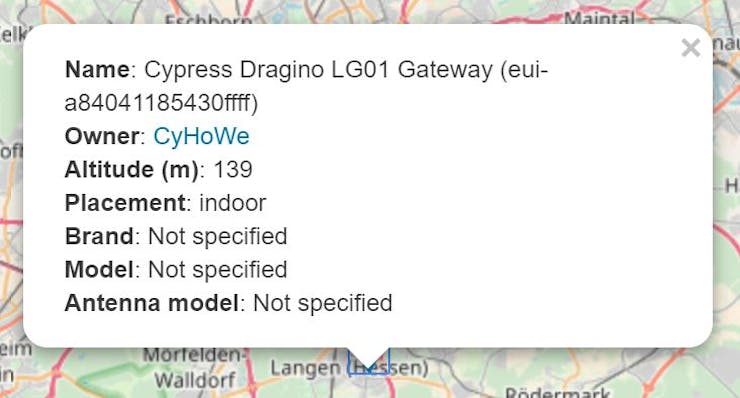 As no public TTN gateway was reachable we have setup our own Single-Channel-Gateway, based on Dragino LG01-S. This gateway has been registered at TheThingsNetwork and shows up in the map (Figure 5, Figure 6) whenever connected to the network.