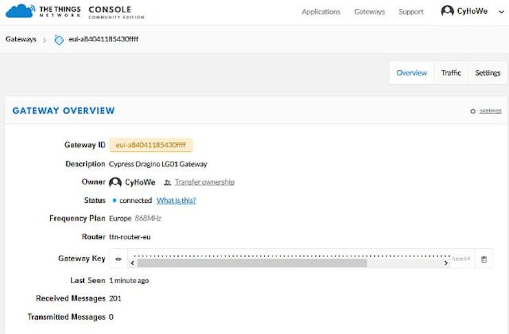 Figure 7 shows online that the Cypress gateway is connected and was seen last time just a minute ago. More than 200 messages have already been received.